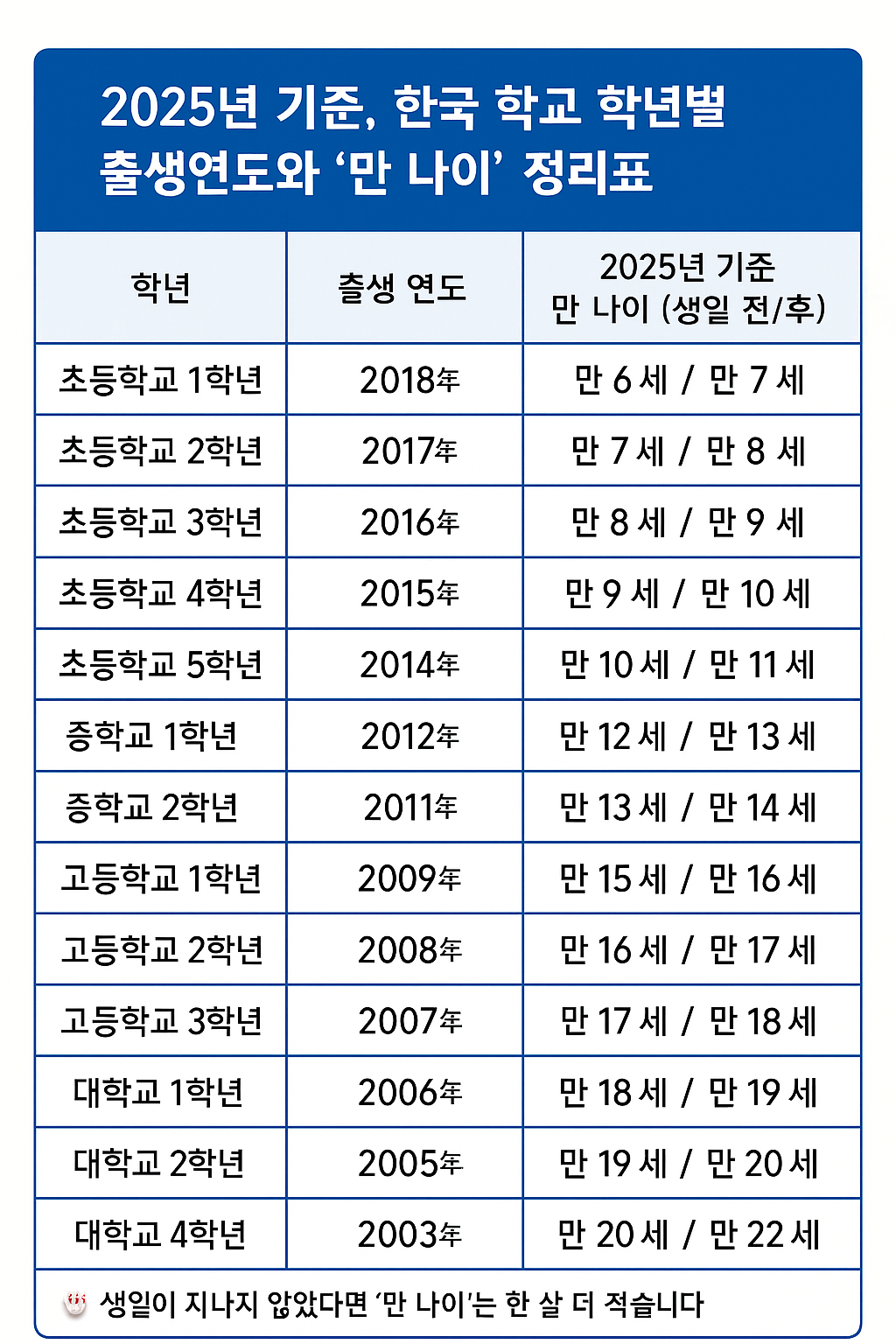 | 학년 | 출생 연도 | 2025년 기준 만 나이 (생일 전/후) |